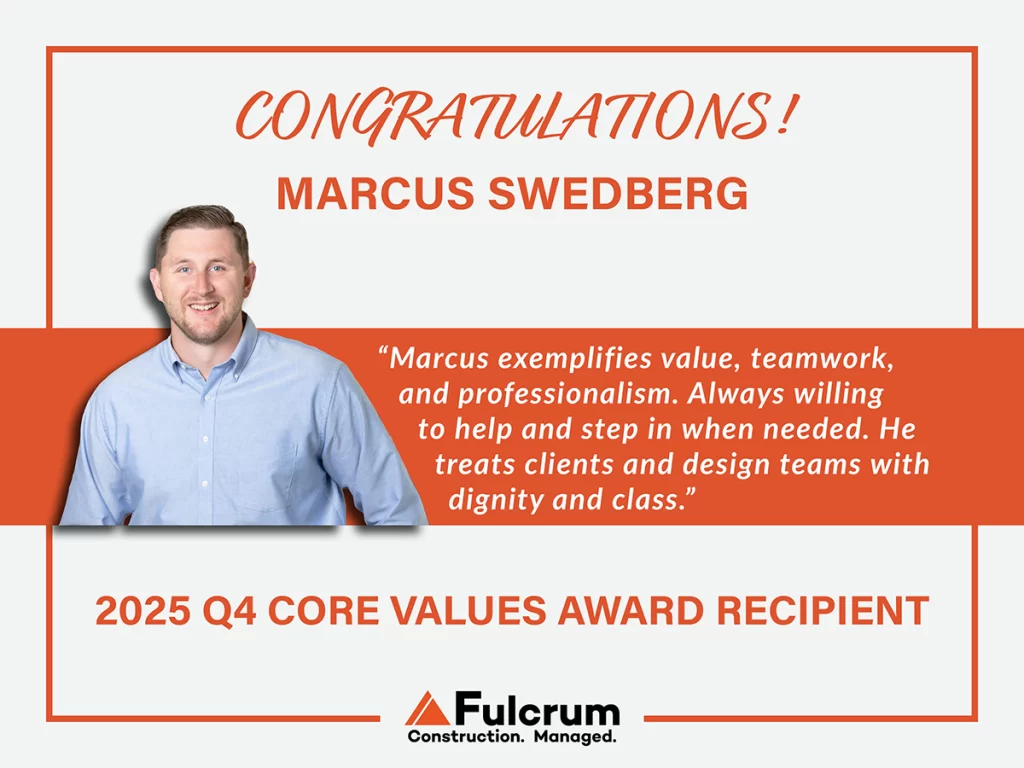 Posted by Fulcrum Associates on 01/13/2026We’re proud to recognize Marcus Swedberg as our Q4 2025 Fulcrum Core Values Award recipient! “Marcus consistently exemplifies value, teamwork, and professionalism. He is always willing to help, step in when needed, and support those around him. Marcus treats clients and design teams with dignity and class, strengthening relationships, earning praise, and driving meaningful results for our clients and our company.”